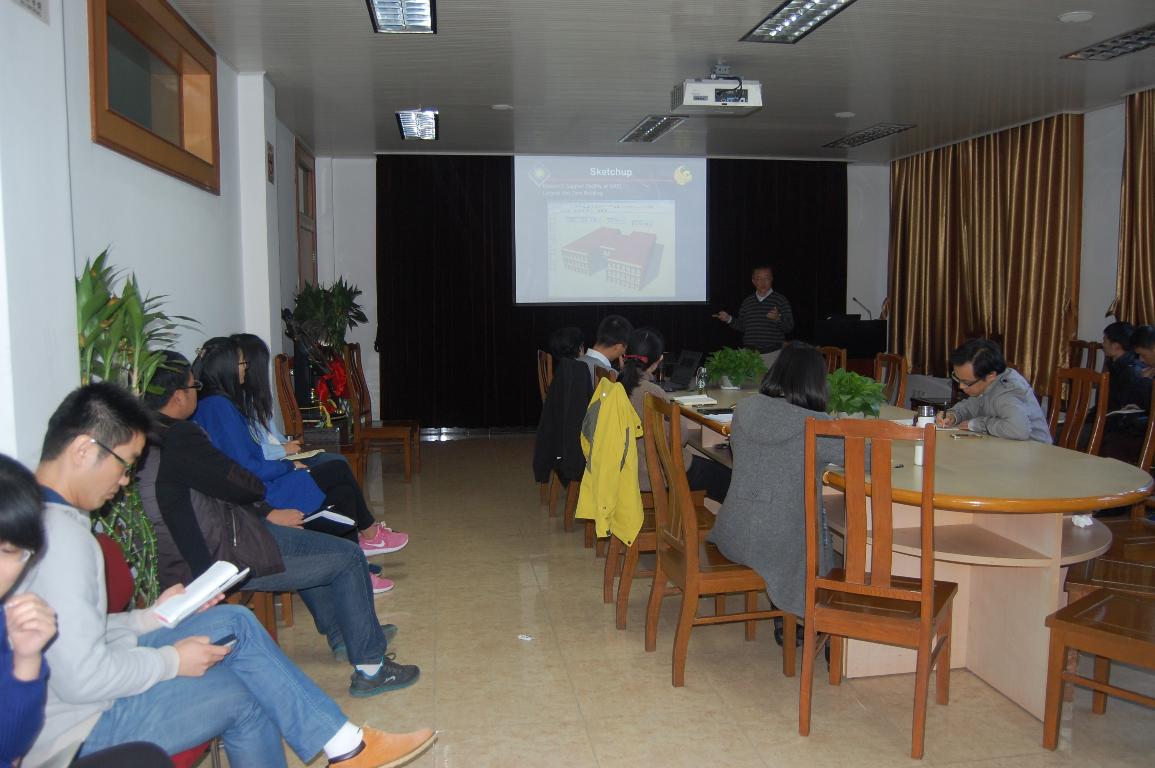顾力行博士是美国能源部EnergyPlus开发项目首席研究员,有10年的EnergyPlus开发经验和20年的建筑能耗模拟经验。报告中,顾博士首先结合自己多年的工作经验,向学生们介绍了EnergyPlus软件的知识背景和核心技术,并鼓励同学们进行相关的创新;之后顾博士又对今年新发布的模拟大空间建筑室内环境模块的原理及其应用进行了详细讲解,为我院大空间研究方向的研究提供了一条新途径。