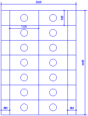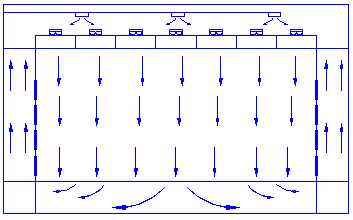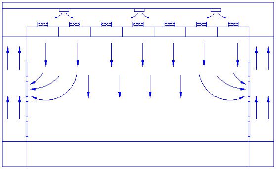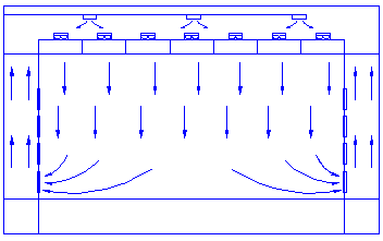 层流洁净室目前正进行施工安装,预计2012年10月完成。洁净室尺寸为4445mm×3200×2100mm,室内面积14.2m2。工作人员通过洁净室入口处的风淋室进出洁净室。洁净室屋顶满布FFU,满布比为65.6%,FFU风机电机为直流无刷型,室内气流速度范围0.4m/s-1.0m/s。FFU布置以及侧墙回风口布置如图25所示。实验室地板采用高架地板,以形成下回风,从而室内形成垂直层流的气流组织,同时洁净室两侧墙面开有回风口,可形成上送侧回的准层流洁净室气流组织形式,根据回风口高度不同,上送侧回形式略有不同详见图26所示,实验室两侧为回风夹墙,回风道近屋顶侧布有干盘管显热换热。洁净室设计新风量为120m3/h,最大新风量可实现1000m3/h,新风机组采用粗效、中效、高效三级过滤,采用的过滤器分别为G4、F6、H13型,FFU过滤器效率为H14。室内正压可保持15Pa。