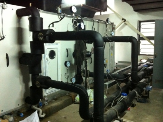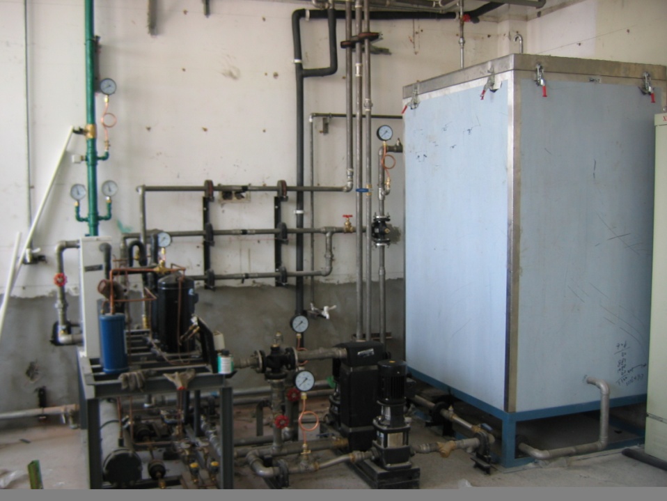 该实验系统于2012年8月完工,它是实训中心大空间热环境基地的供能实验系统,目前实验系统可以完成室内恒温恒湿控制、地源热泵地下埋管换热器的研究、地源热泵土壤收支热量平衡等研究,另一方面还可以为建筑环境与设备工程专业的本科教学提供教学平台。