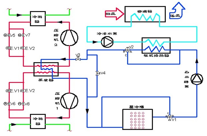 该实验系统建于2007年,是采用冰蓄冷为冷源的低温送风中央空调系统。实验系统见图15,冰蓄冷采用封装冰球式蓄冷装置,由两台双工况冷水机组(单机空调工况制冷量为6.5kW)提供冷量。图16为该系统原理图,25%的乙二醇溶液为载冷剂,为空调系统提供2℃~7℃的低温冷媒水;通过控制管路系统的切换,实验台可实现制冰蓄冷工况、融冰供冷工况、制冷机组单独供冷工况及主机与蓄冰槽联合供冷等四种工况的手动或自动运行。