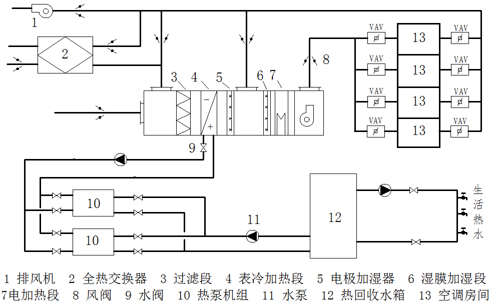 该系统主要集成了二次回风空调系统、常规变风量系统、变风量地板系统、风机盘管系统、冷凝器热回收、空气全热交换热回收、湿膜加湿、热泵机组以及PLC控制系统等。可为变风量控制方法、排风热回收及冷凝热回收节能、回风变风量控制、湿膜蒸发冷却加湿节能、变风量末端和风机盘管的舒适及节能等研究提供实验平台。