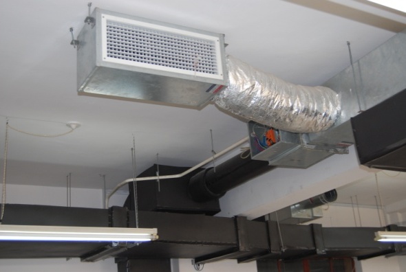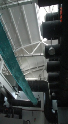 学校工程实训中心数控机床实习用大空间热环境实验系统建于2011年,该系统正式完工于2012年8月,目前已进行2012年夏季实验。实验系统面积约500m2,坡屋顶,最高处达13m,其送风系统形式沿袭了乒乓房大空间热环境实验系统的形式,此外,利用建筑特征在屋顶处还装有机械排风系统,实验基地与空调机房内景间图6和图7。其能源供应系统采用地源热泵与空气源热泵的组合,详见大空间地源复合热泵创新实验系统。