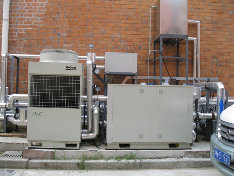 该实验系统中地源热泵空调实验系统地埋管井29口,埋管深度90m;分别按4米、5米、6米三种间距布置地埋管井,地源热泵机组1台,100kW;此外系统还有风冷热泵机组1台,30kW。整个风系统有组合式空气处理机组1台,风量30000m3/h,风机全压1400Pa,风机可变频控制。图8为地源复合热泵实验系统地源热泵与空气源热泵布置外观。