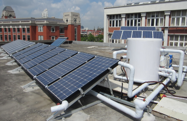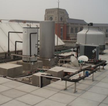太阳能蓄热实验系统建立在建筑太阳能一体化的基础上建设而成。由于太阳辐射的日夜变化以及受天气状况影响很大,辅助热源和蓄热装置几乎是必备的部件。目前许多太阳能热水系统采用电加热作为辅助热源,由于电加热器的安装功率都很大,消耗大量宝贵的电能,本热水系统以热泵为辅助热源,采用多水箱蓄热方法,可以实现太阳能集