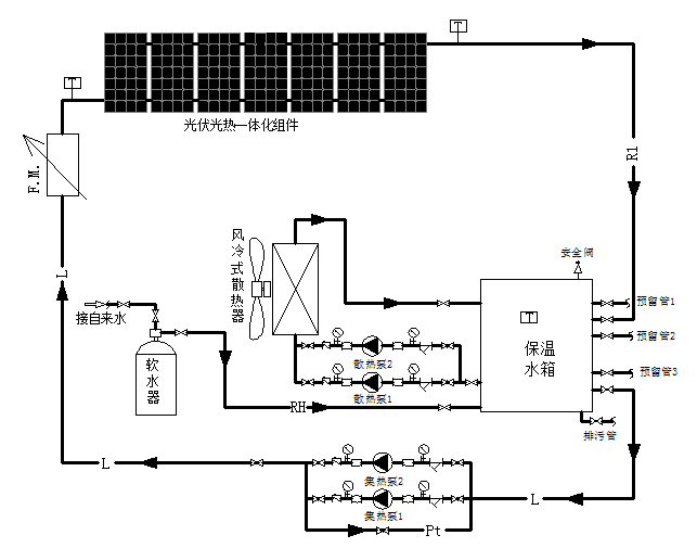 太阳能光伏光热一体化发电系统中水系统集热循环泵由光伏光热一体化组件出口温度与水箱温度之间的温差来控制启停,当温差高于设定温度时,集热循环泵开启,当温差低于设定值时,集热循环泵关闭。同时,在实验系统中需要保持水箱恒温时,可通过散热泵与风冷散热器散热,其中风冷散热器变频控制。实验系统可通过实验平台光伏光热组件与单独光伏组件的比较、光伏光热组件跟踪太阳辐射角的实验,获得太阳能综合利用的效果,以研究太阳能发电和供热综合利用。