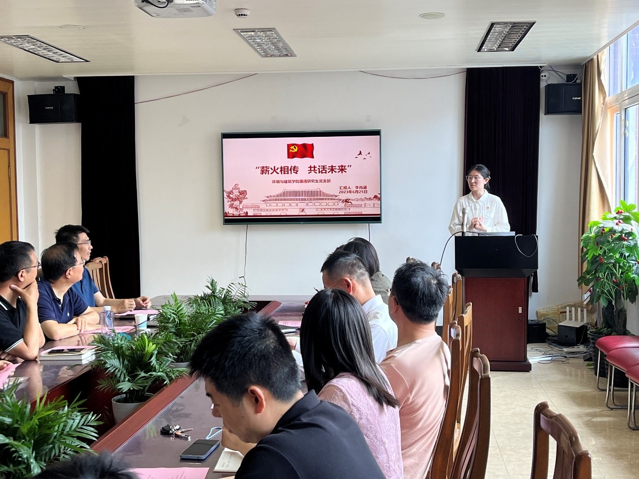 作为一名三十五年的老党员,陈剑波教授对建环系教工党支部、研究生党支部的发展贡献巨大。校优秀党支部书记李肖涵同学作为学生代表,汇报了研究生党支部近年来的主要活动与获奖、思想引领与实践活动、支部的建设与发展以及未来建设工作的规划。支部党员们聚焦重要精神,促进思想交流,利用网络媒介紧跟思想潮流,并加强实践锻炼,通过为新生宿舍检测空气品质、校园文明清洁与文明停车志愿等活动,展示了建环系新生力量的风采。