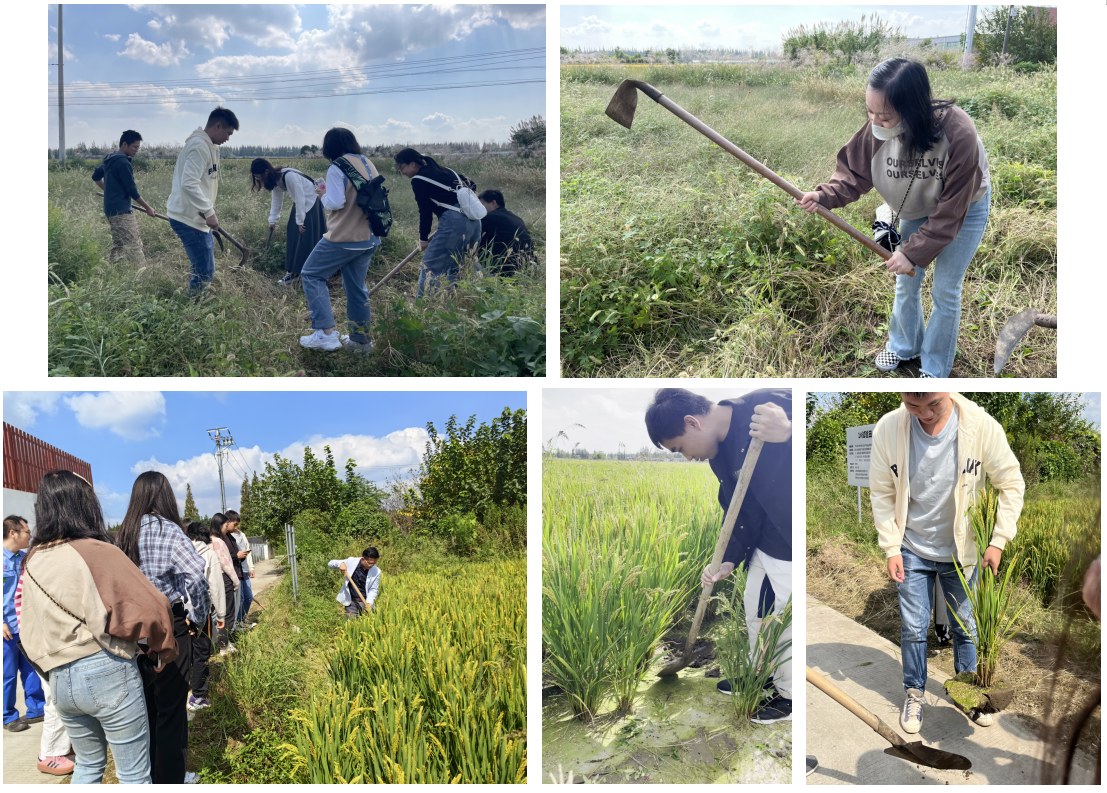该项目还将生态环保产业与农业生产结合起来,形成绿色循环产业的闭环。下午,同学们在利用农业废弃物厌氧沼液开发高品质液态肥技术种植水稻的试验田,由上海农科院的老师给我们讲解了施用沼液/液态肥对于水稻的生育性状、产量与品质的影响以及适宜液态肥施用量和施用规程,并介绍了如何在采样过程中刨挖水稻。随后,同学们在试验田荒地进行了集体除草活动,为今后进一步拓展有机肥的施用提供改良场地。