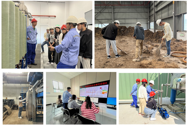 在公司技术负责人的带领下,团队首先来到上海崇明农业废弃物资源化综合利用项目现场,对利用种养废弃物进行沼气发电和生产有机肥的核心工艺进行了整体学习,该项目的核心工艺采用了瑞士 “车库式”干式厌氧发酵技术,可处理猪粪73,000 吨/年,处理秸秆31,000 吨/年,年发电量506.4万kW·h/年,年产有机肥30,000吨,每年减少向大气排放温室气体30122t(折合CO2)。随后,同学们在厌氧储料仓、秸秆的整理与传送带及中央控制室中,在值班工人的带领下分组进行了劳动实践,通过对室外压力泵系统的读数与操作方法以及超滤膜、反渗透装置的动手操作,在“带味儿”和“带劲儿”的劳动体验中,同学们对厌氧发酵工艺和全自动机械化系统有了更加深入的理解。