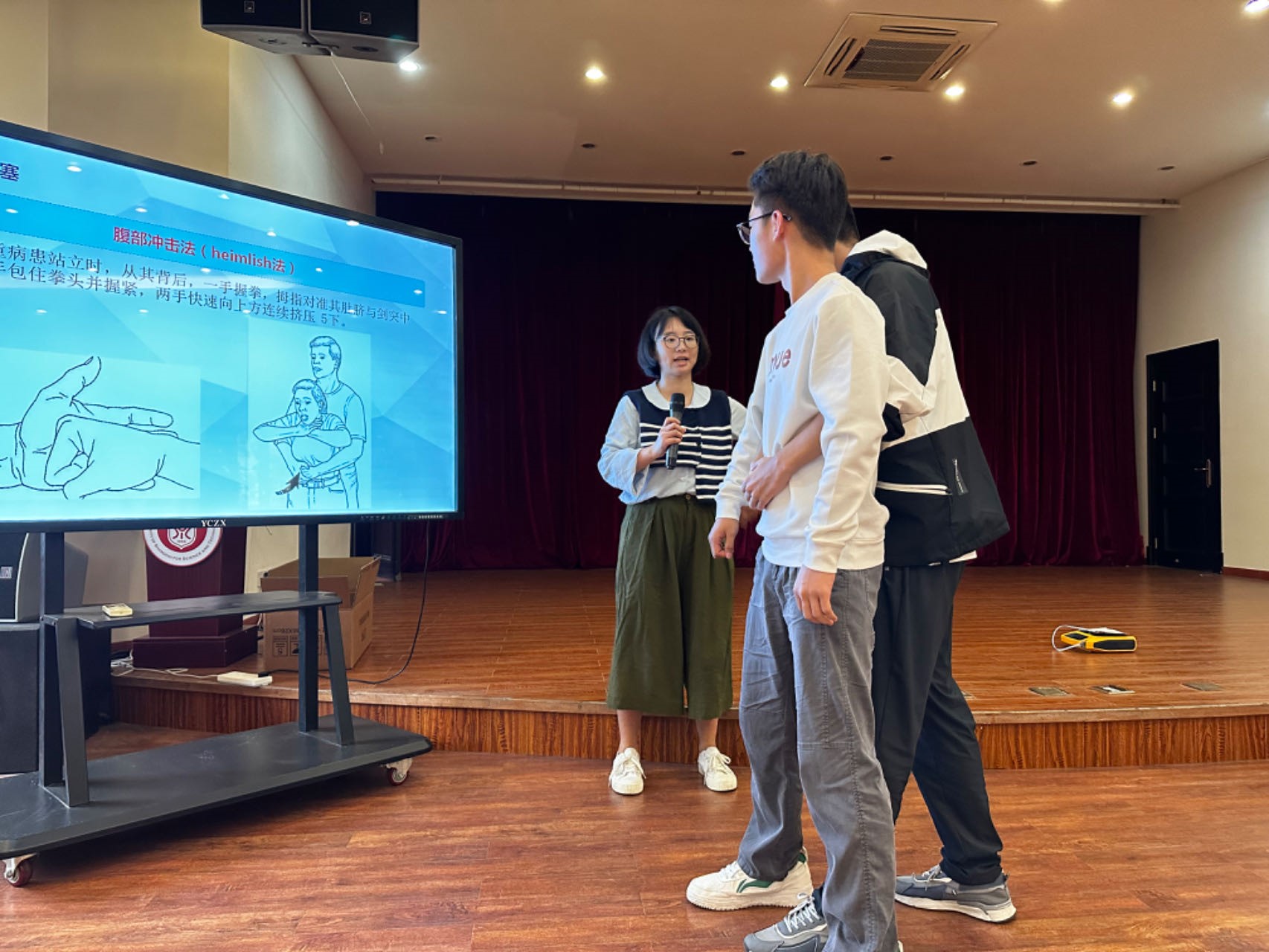 张文俐医生从心肺复苏的意义、操作步骤、特殊情况三方面讲解了如何正确开展心肺复苏。并从气道阻塞征象出发,讲解了成人和婴幼儿的Heimlish不同手法和注意事项。随后,现场每一位师生参与到急救演练中去,按照科学的急救顺序“一看、二唤、三呼、四摆”,对教学模拟人开展急救。现场气氛活跃,师生收获良多。