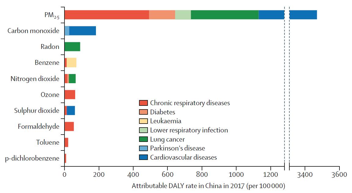 研究团队基于文献系统综述、荟萃分析和渗透系数法、时空高斯过程回归模型,获得了近20年中国内地全部省级行政区主要室内空气污染物浓度数据,以及我国室内空气污染物与心血管疾病、肺癌、白血病、哮喘等多种健康结局间的暴露反应关系,藉此采用人口归因分数,结合全球疾病负担数据,获得了我国室内空气污染暴露造成的疾病负担(DALYs即伤残调整生命年)和经济损失。
