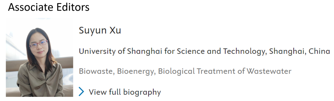 徐苏云副教授是我校环境科学与工程系副教授、系副主任,现任国际期刊Bioresource Technology副主编、Environmental Technology编委、Microorganism客座编辑、中文核心期刊《环境卫生工程》编委、联合国巴塞尔公约亚太区域中心化学品和废物管理智库专家。研究领域主要为:固体废物处理与资源化、厌氧生物技术、污水绿色低碳处理技术等。主持国家自然科学基金面上项目和青年项目、上海市自然基金等科研项目,在Bioresource Technology, Chemical Environmental Journal, Waste Management等期刊上发表论文80余篇,他引频次2000余次;获上海市技术发明奖二等奖(2022年)、上海理工大学“志远学者”称号(2018年)、比尔盖茨基金会厕所创新大赛优秀理念奖(2016年)等荣誉。