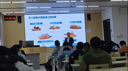 赵宏斌先生以《水质监测实用技术》为题,基于应用角度向同学们介绍了水质监测的基本原理和流程,包括水质监测各个环节,包括采样、分析、数据处理等,让同学们对现场水质监测有了更加全面认识;结合自己在水质野外监测的丰富经验,分享了无人船、水质自动监测站、浮标监测系统等在水质监测、水域巡查等领域的应用前景,并对河湖环境监测解决方案和成功案例等情况做了详细介绍。赵宏斌先生的精彩分享,不仅让同学们学到了实用知识和技术,还激发他们关注环保、投身环保的热情,从理论到实践,再到创新实用技术,助力同学们把论文写在祖国大地上!