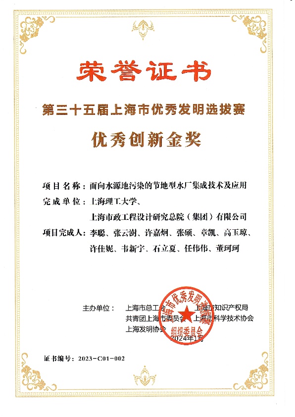 近日,由上海市总工会、上海市知识产权局、共青团上海市委、上海市科学技术协会、上海发明协会等单位联合举办的“第三十五届上海市优秀发明选拔赛”结果公布,上海理工大学和上海市政工程设计研究总院(集团)有限公司合作,李聪教授领衔的项目“面向水源地污染的节地型水厂集成技术及应用”荣获上海市优秀创新金奖。这是对李聪教授团队在饮用水安全保障研究领域长期耕耘的成果,也是对团队科学研究及应用转化的重要肯定和鼓励。