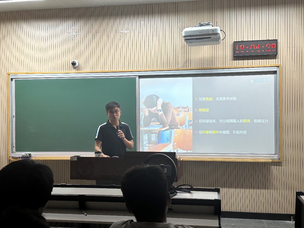 主讲嘉宾姚毅毕业于上海交通大学,是STARS五维情绪调整系统和慢行教育科技创始人,超10余年全球多地的情绪管理教育辅导经验。他从当下青年面临的情绪问题入手,讲解数据和实例,分析原因并给出建议。现场同学对自己当下遇到的人际关系、考试压力等具体问题与嘉宾进行了热烈互动。
