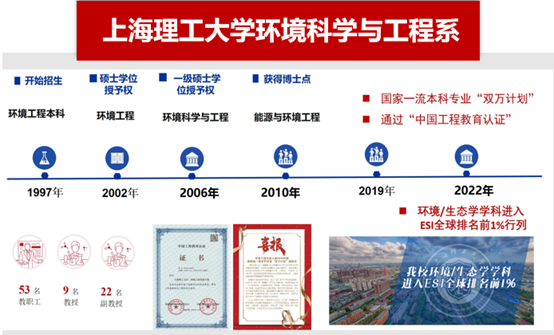上海理工大学环境科学与工程系成立于1997年,目前拥有环境科学与工程、资源与环境、土木水利(市政工程方向)3个硕士学位授权点,能源与环境工程二级学术博士学位授权点。现有教职工53人,其中教授9人,副教授22人。拥有国家级人才1人次,省部级人才16人次。2022年上海理工大学环境/生态学科ESI全球排名进入1%。本学科的环境工程为国家一流专业,通过国家工程教育认证;拥有国家级一流课程、上海市级教学团队、上海市教学成果二等奖、上海市重点课程、上海高校国际学生英语授课示范性课程、上海市课程思政示范课程等荣誉。近三年获得省部级科技奖项10余项,包括获上海市技术发明二等奖、上海市科技进步奖二等奖、机械工业部科技进步奖、华夏建设科学技术、中国发明创新金奖等。