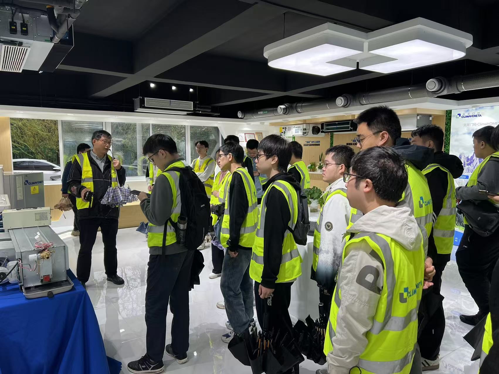 在克莱门特公司,工程师带领同学们参观了多个生产车间和展厅,学习了风冷热泵机组、水冷冷水机组、制冷组件及空调末端设备的生产与制作,并了解了克莱门特的空调设备智能化控制系统。