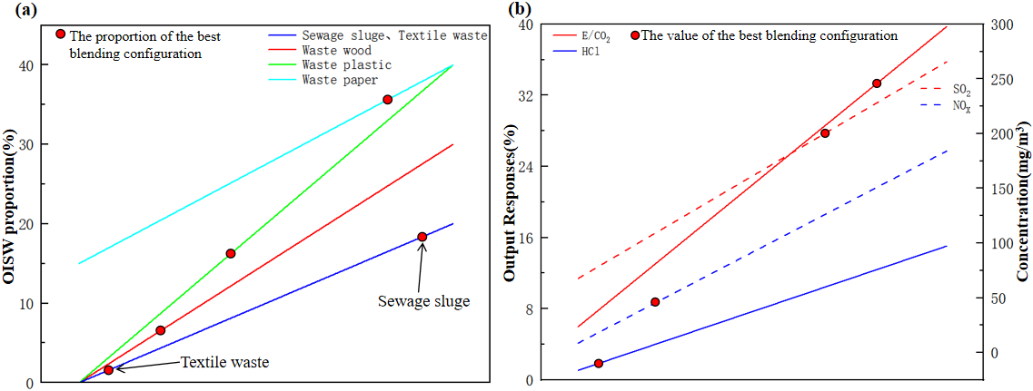 图2. (a)五种有机工业固废的最优混烧比例;(b)最优条件下的输出值.