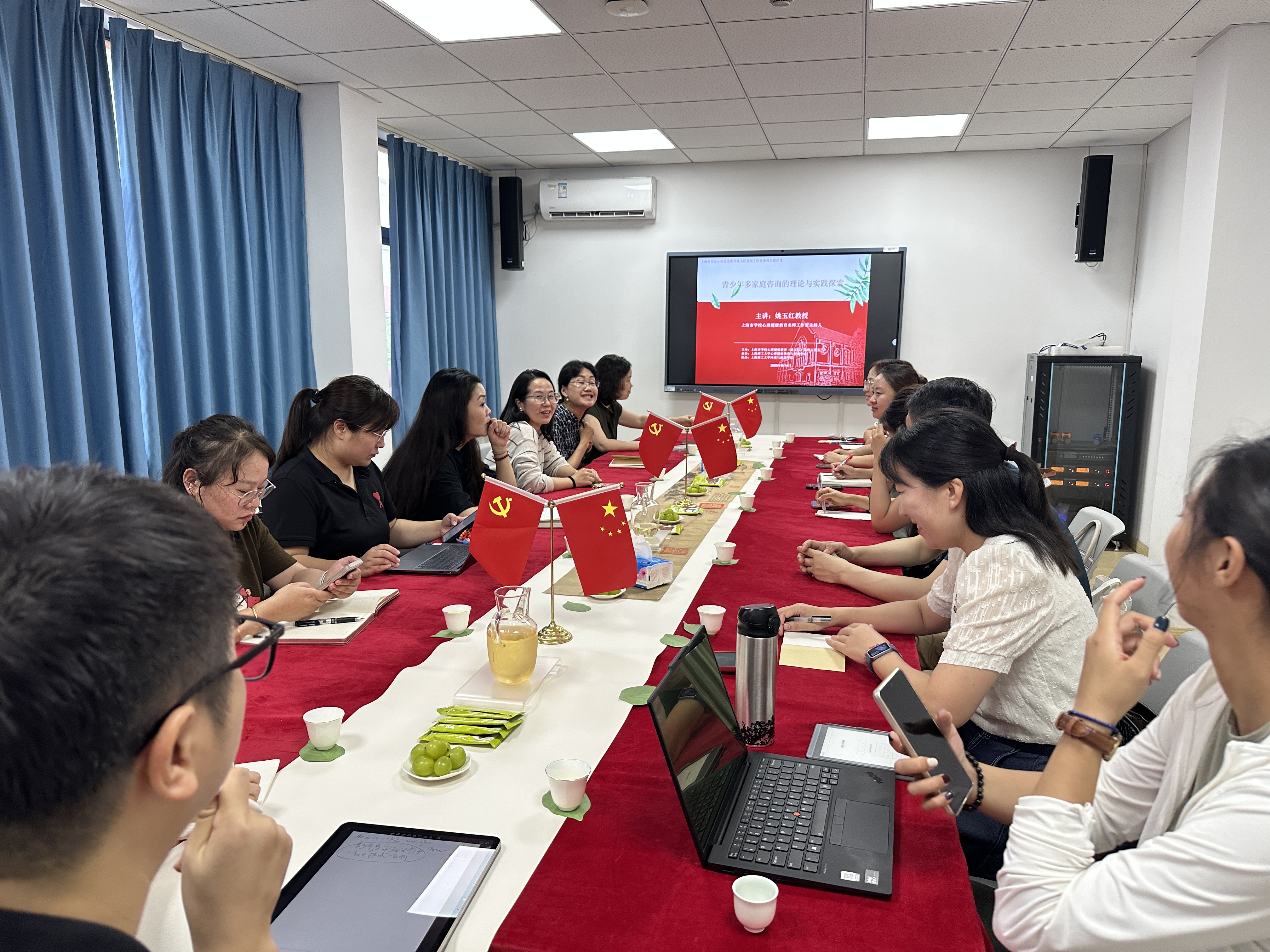 9月4日下午,以“青少年多家庭咨询的理论与实践探索”为主题的茶文化心理沙龙,于上海理工大学云顶集团4118网址2号楼205室顺利举办。本期沙龙由上海市学校心理健康教育姚玉红名师工作室主办,云顶集团4118网址土木专业研究生党支部、学院心理分中心承办。云顶集团4118网址党委副书记周蓉、学校心理健康教育与咨询中心主任杨颎、校心理专兼职老师、学院党支部师生、工作室全体成员一同参与了学习交流。沙龙以红色茶席拉开帷幕,党支部副书记、名师工作室成员王木子老师带领大家开展茶心冥想,以茶联结身心、激发家国情怀,实现“小我”融入“大我”的精神升华。